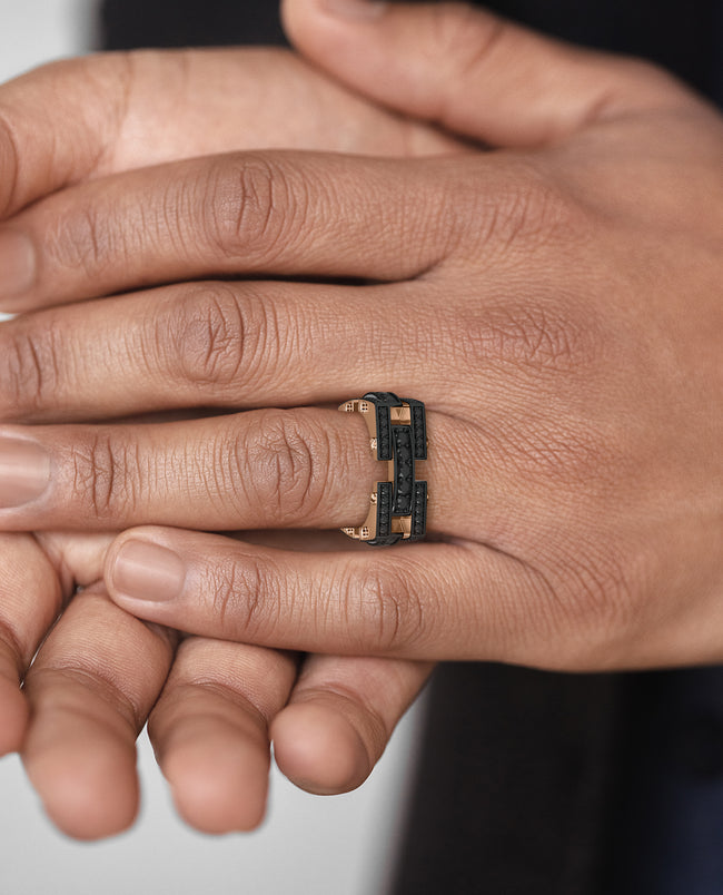 This is pure innovation in a men’s wedding band originally created in homage to modern architecture, a bold, creative concept with a few Rockford signature flourishes, and obsessive attention to the detail. This men’s 2.15ct black diamond ring will make an exquisite men's wedding band in addition to being a one-of-a-kind designer ring. Ready to Ship rings are pre-produced, unworn pieces. These rings have a short turn-around time of only 1-2 business days.