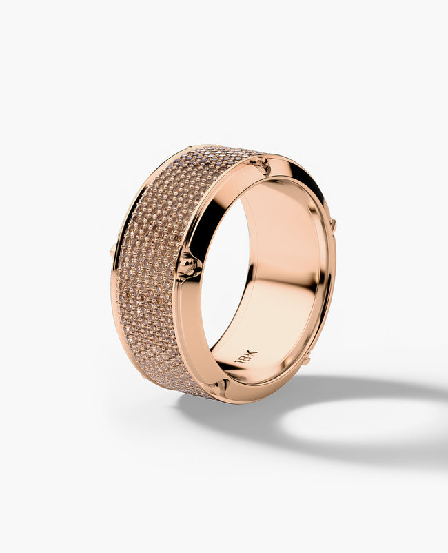 The CORTEZ ring is available in plain and a combination of 2.40ct brilliant cut brown diamonds in a pave setting adjacent to shimmering gold. The CORTEZ ring features a sleek interior, creating a beautiful contrast with the diamond exterior. Available in multiple variations, the Cortez is special in its feel and look. The versatility of the CORTEZ gold ring makes it a perfect match for any character that embraces style and individuality.