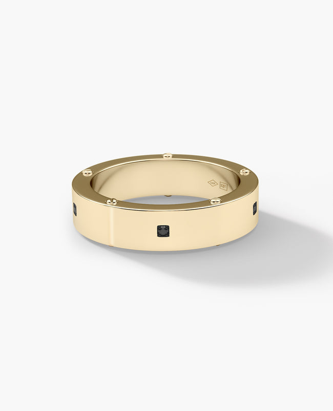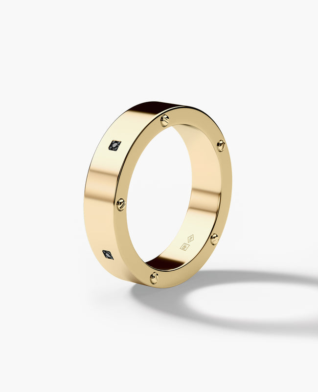 This Norse is Rockford Collection's interpretation of a classic wedding band. The Norse ring features a single 0.05 carat black diamond - a guiding light on your journey of life. This wedding band is available in 2.5 mm, 3.5 mm, or 5.5mm, and is complete with Rockford's signature screw details on either side. Personalize your ring further by adding a custom engraving to the inside or outside of your ring. Available in 14k gold, 18k gold, or platinum.