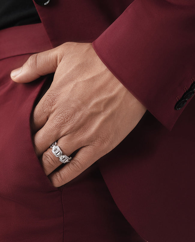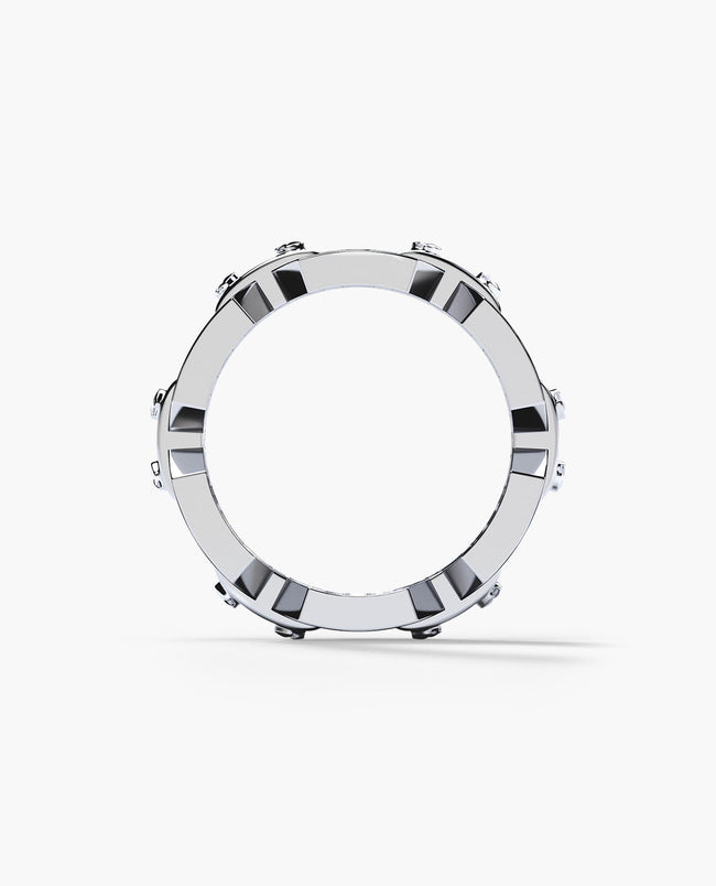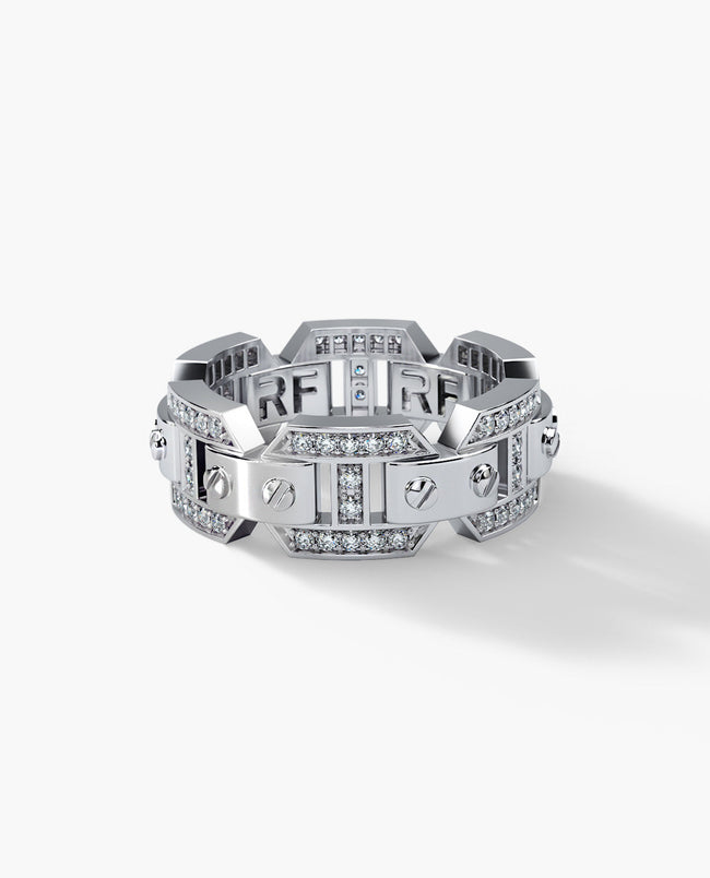 A truly unique design and fine workmanship are combined into one uniquely striking ring with 0.70ct pave set round brilliant cut white diamonds. The Briggs design makes an exceptional statement ring for nearly any occasion, from a night on the town to an eternal wedding band. Ready to Ship rings are pre-produced, unworn pieces. These rings have a short turn-around time of only 1-2 business days.