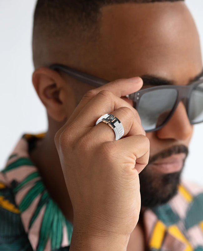 The Atomic ring was designed with flexibility and style at its core. Silicone and precious metals seamlessly fuse together to create the ideal every-day ring for those that work with their hands. This version of the Atomic La Paz features an enlarged 0.35 ct center black diamond, available in 14k Rose Gold. Band colors are exchangeable. Ready to Ship rings are pre-produced, unworn pieces. These rings have a short turn-around time of only 1-2 business days.