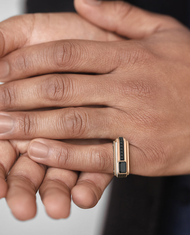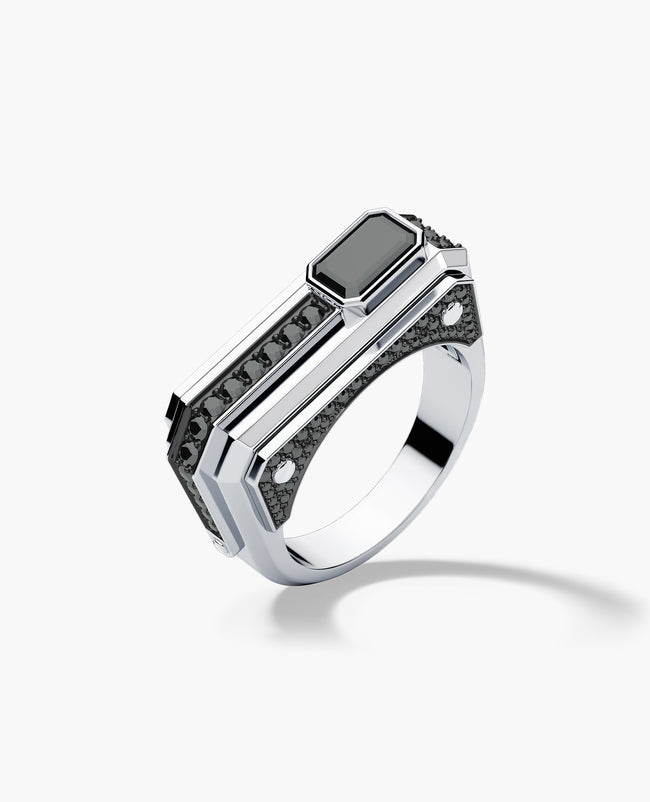 ARTURO Signet Ring is a sculptural masterpiece built for the modern icon. Made in radiant 14k, 18k gold & platinum, this powerful ring fuses architectural precision with refined elegance. The centerpiece: a striking 1.00ct emerald-cut black diamond set in a sleek bezel, surrounded by meticulously hand-set pavé black diamonds that trace every contour with fire and brilliance. Bold lines. Fearless geometry. A statement that never whispers. This ARTURO ring is proudly designed and hand-made in the USA.
