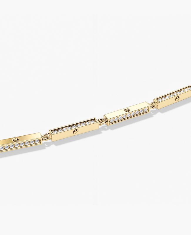 Elevate any occasion with an array of solid gold bars set with natural, untreated diamonds. Complete with Rockford's signature screws, this gold bar chain necklace is hand made to order and is fully customizable with an engraving or custom initials of your choice.