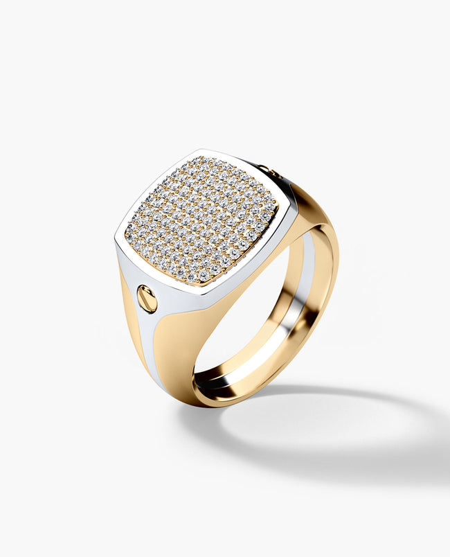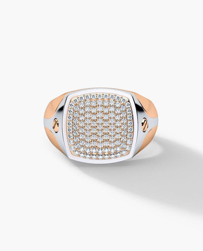 The BETZ two-tone gold signet ring with 0.70ct. pave diamonds is a treasure with a flat top surface designed with silky smooth sides worthy of engraving or simply enjoying the simplicity of the Rockford signature screw design. Again with maximum flexibility of any design, both our signets are designed with individuality and creative freedom in mind. The BETZ, available in multiple variations, can easily transform into a pinky ring or a chic statement piece.