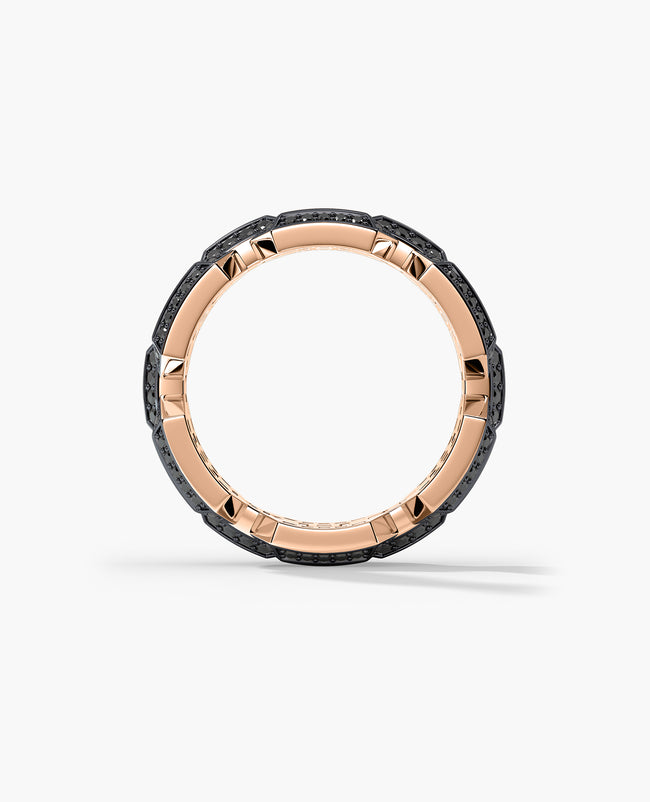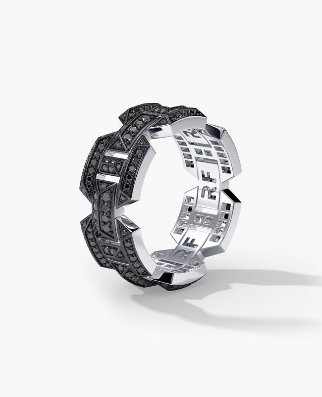 A truly unique design and fine workmanship are combined into one uniquely striking ring with 1.30 ct pave set round brilliant cut black diamonds. This ring is available in 50+ variations. The Edge Briggs design makes an exceptional statement ring for nearly any occasion, from a night on the town to an eternal wedding band.
