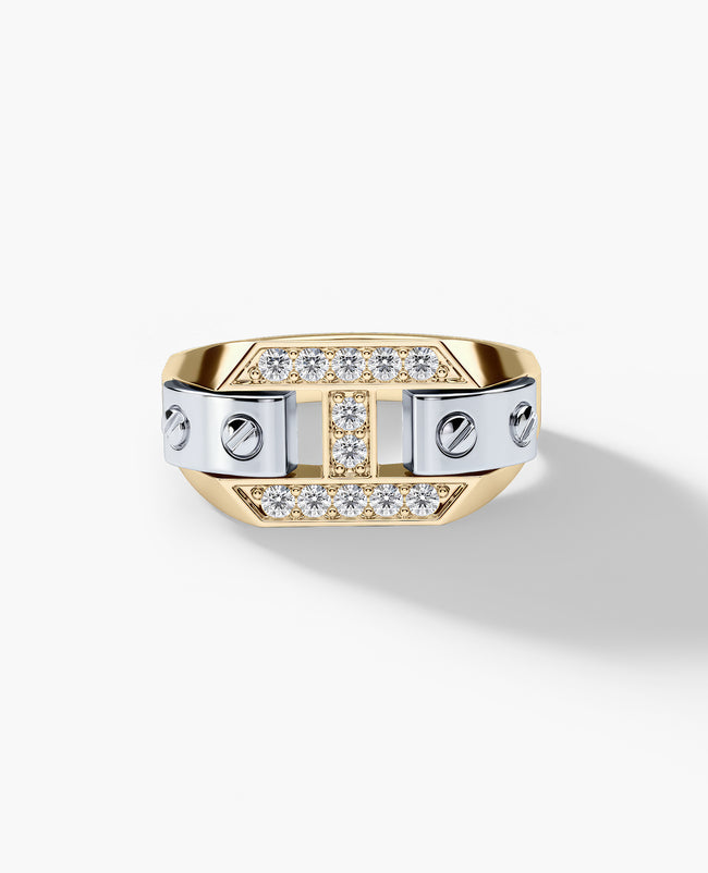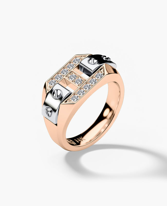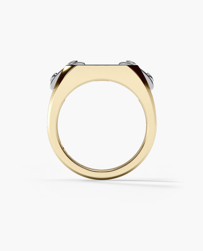 The Briggs signet is instantly recognizeable thanks to it's iconic H-link. The Briggs link is set with 0.25 carats of F/G color, VS1-VS2 diamonds held in place by Rockford's signature screws. Intentional cutouts in the face of the Briggs signet add to the intricacy of the ring. The solid gold band of the Briggs signet is fortified with a traditional fit and plenty of space for a custom engraving.