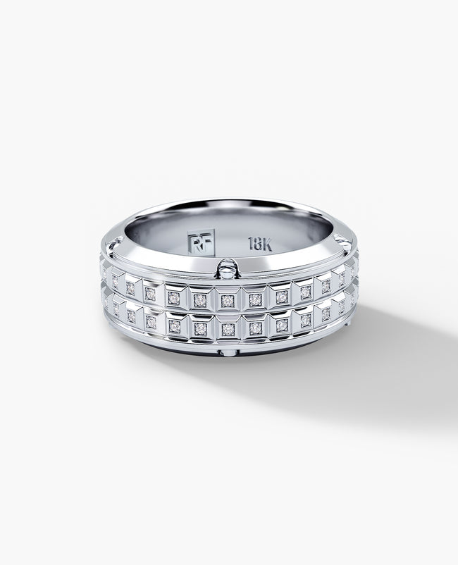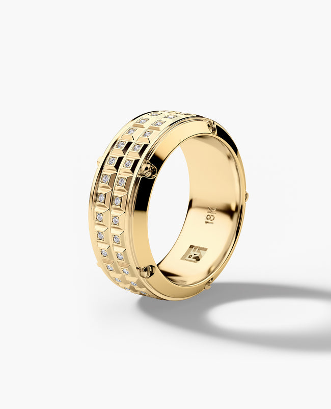 The Calhoun gold ring with diamonds is the synthesis of modernity and class. This uniquely geometric design features a 10 mm comfort fit band with 0.30 carat pave set diamonds. Each diamond is showcased with precision and is nestled within raised facets for a distinctively unique look. Finished off with Rockford’s signature screw design, the Calhoun ring is ideal for those looking for understated novelty in their daily ring.