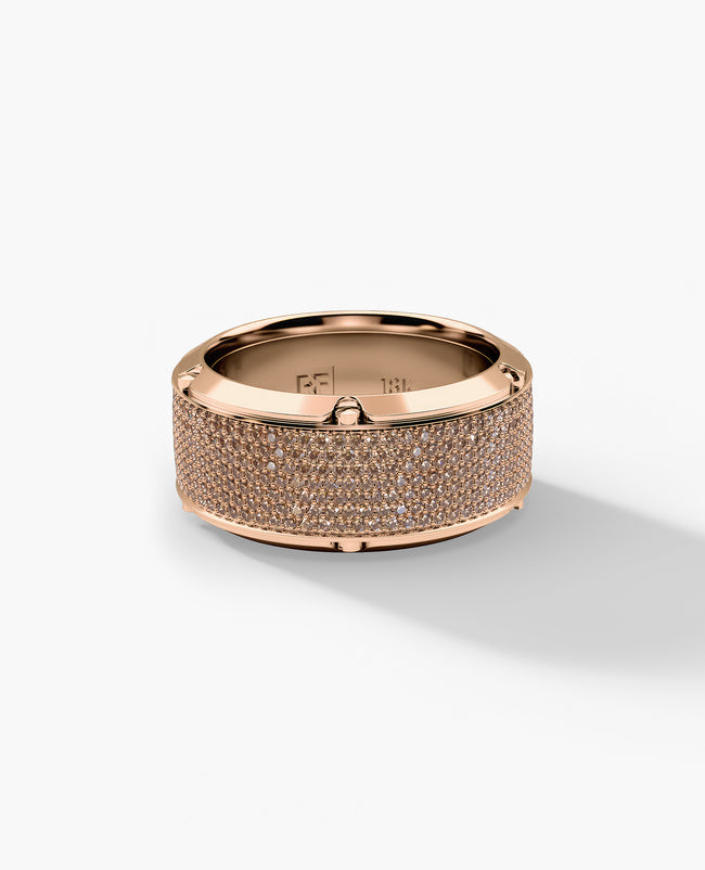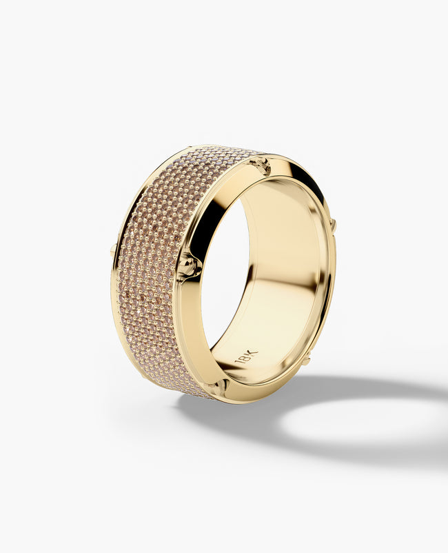 The CORTEZ ring is available in plain and a combination of 2.40ct brilliant cut brown diamonds in a pave setting adjacent to shimmering gold. The CORTEZ ring features a sleek interior, creating a beautiful contrast with the diamond exterior. Available in multiple variations, the Cortez is special in its feel and look. The versatility of the CORTEZ gold ring makes it a perfect match for any character that embraces style and individuality.