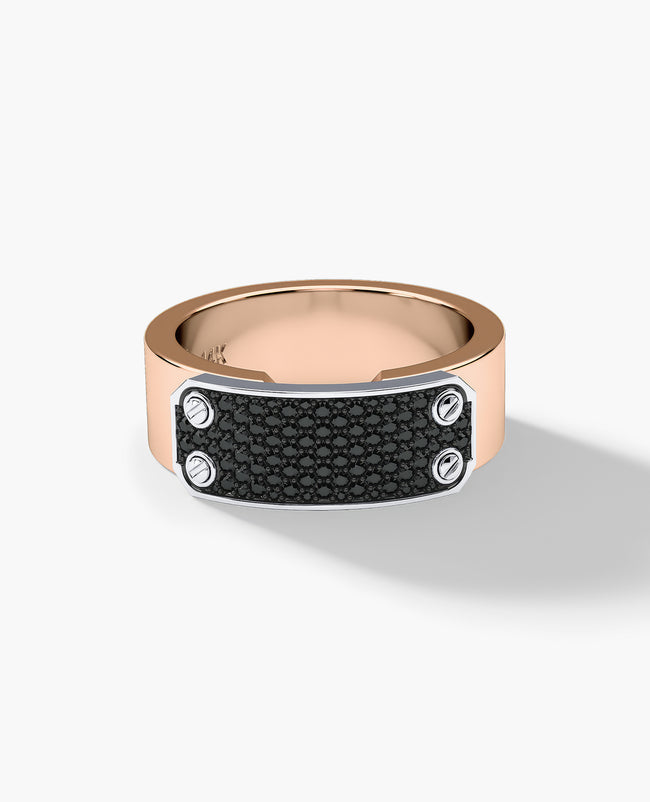 The Donlin plate ring features a solid gold plate set with 0.40 carat natural black diamonds. The plate is secured in place by Rockford's signature screws. This variation of the Donlin is 8 mm wide. The interior of this ring can be customized with a personal engraving. Available in your choice of two tone 14k gold or 18k gold.