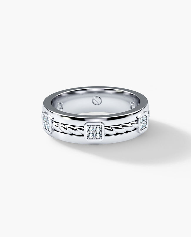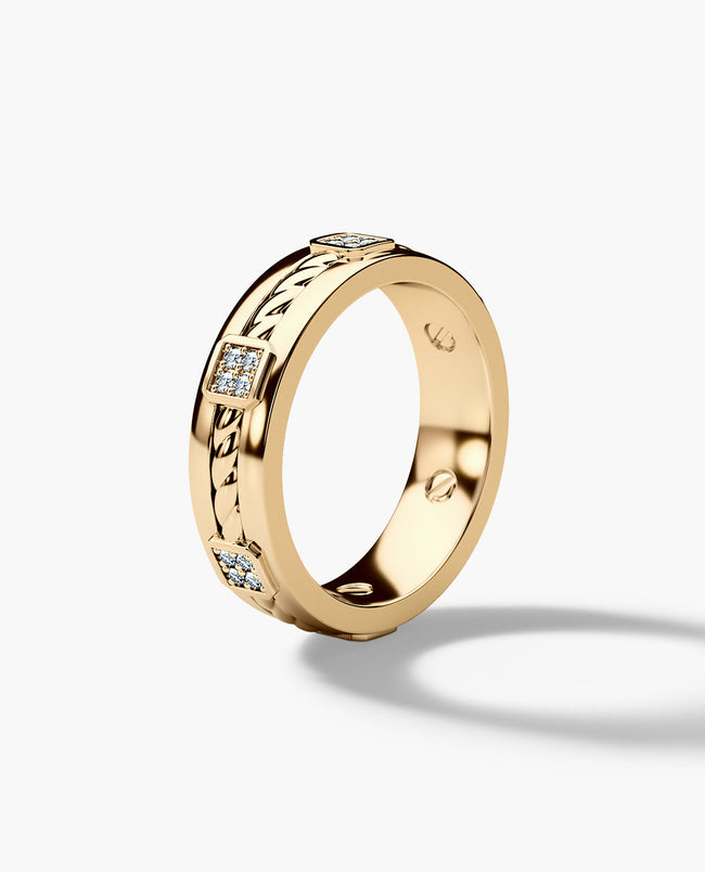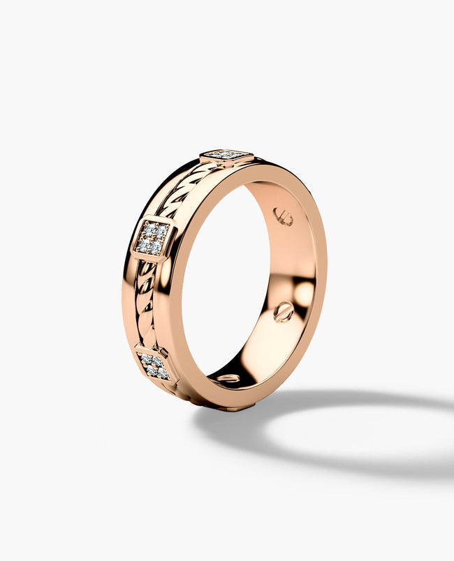 The FAIRBANKS ring with 0.25ct diamonds, available in multiple variations, features a strong design foundation available either with or without diamonds. The interior of the ring is finished in a smooth gold, making the band both stylish and suitable for daily wear. Recognizable thanks to Rockford’s signature rope design running through the middle, the FAIRBANKS ring can be worn as both a bold fashion statement ring and a unique wedding band.