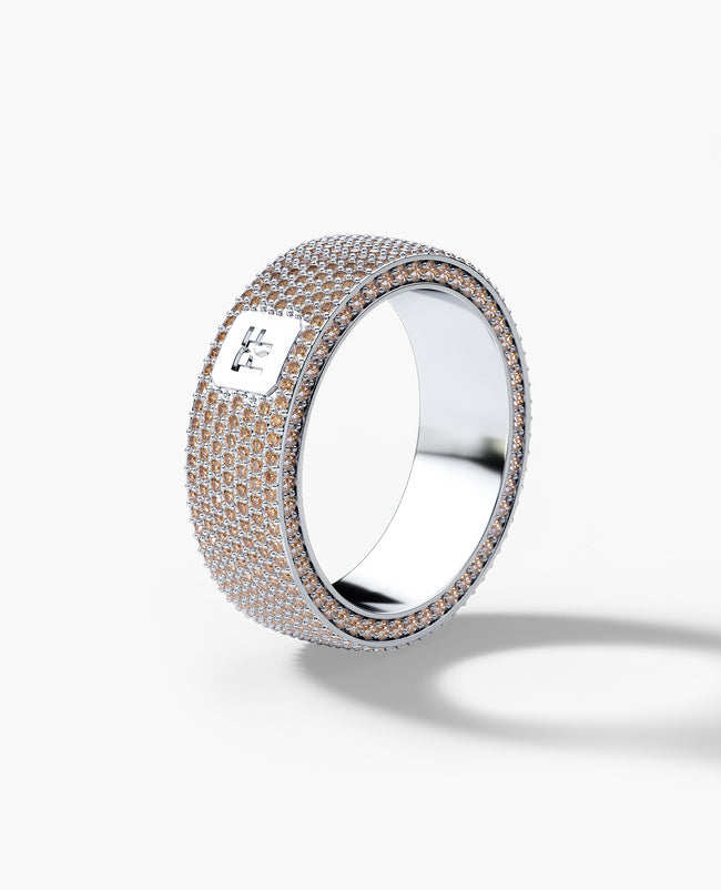 This Rockford ring with 3.30ct brown diamonds from the “American Legend” collection epitomizes sophistication and modern design with a brushed finish in comfort fit gold ring and fiery round diamonds pave set on each profile. The Jerrit band is available in multiple variations and was designed to fit into any situation, from the boardroom to the wedding altar.