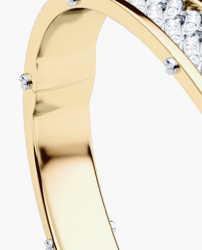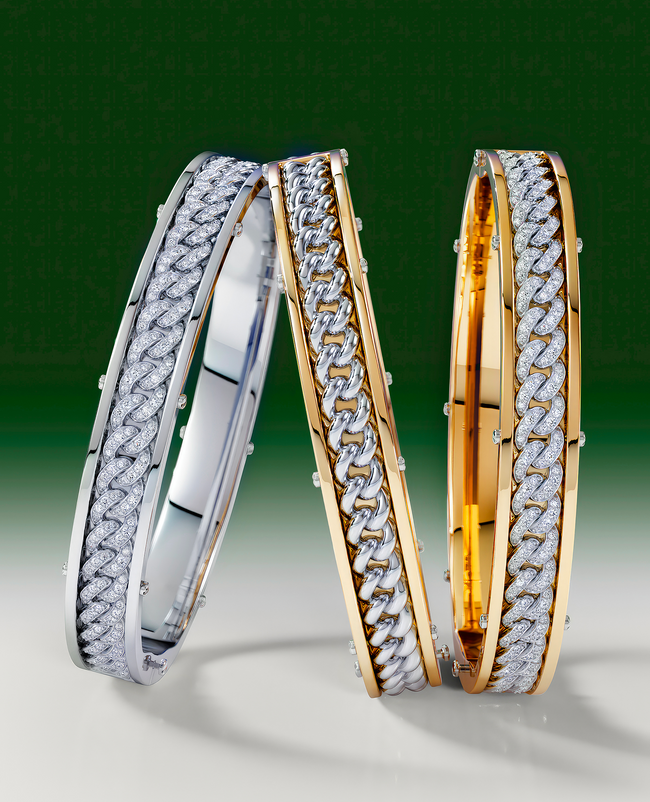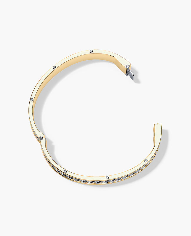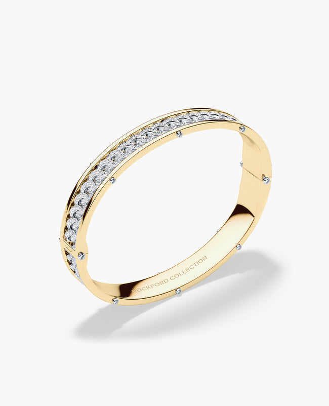Boldly engineered for those who appreciate striking, unique jewelry pieces, the KENSINGTON Bangle Bracelet redefines elegance through a perfect fusion of classic design and modern craftsmanship. Available in multiple variations, this standout piece showcases interlocking Cuban link in radiant two-tone gold and includes the signature Rockford screw design along the side of the bracelet. Each link is set with round brilliant-cut diamonds, creating a captivating sparkle that embodies both strength and sophistication.