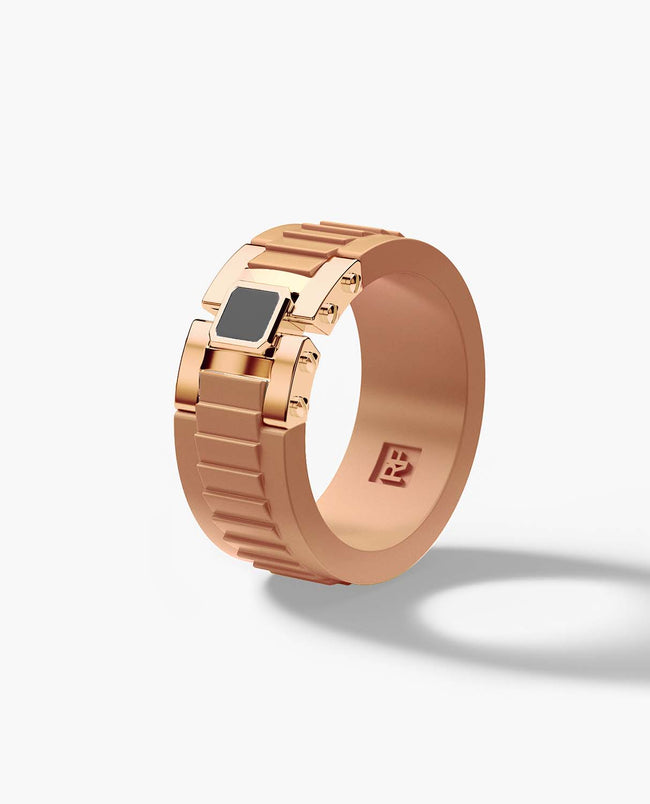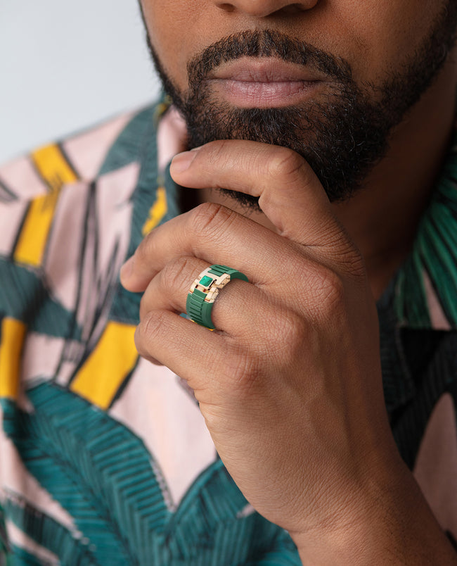The Atomic ring was designed with flexibility and style at its core. Silicone and precious metals seamlessly fuse together to create the ideal every-day ring for those that work with their hands. Band colors are exchangeable.