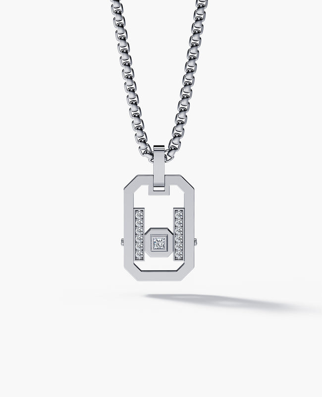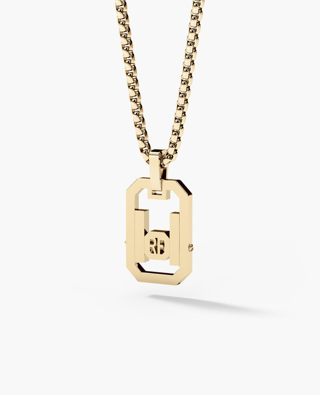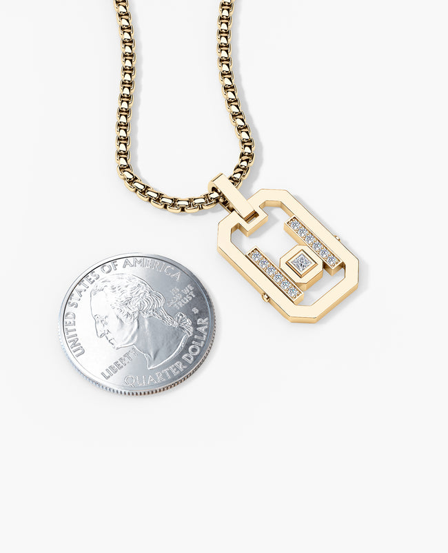 Characterized by its angular lines and intricate details, this gold pendant with diamonds was designed in Rockford’s iconic La Paz style to perfectly compliment your collection of La Paz rings and accessories. This pendant features 0.25 diamonds secured in space by our signature Rockford screws. Wear it alone or layer it with your favorite gold chains, this unique art-deco inspired pendant is sure to make a statement in any setting. Available with or without a Rockford Collection solid gold box chain.