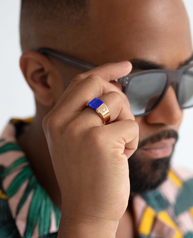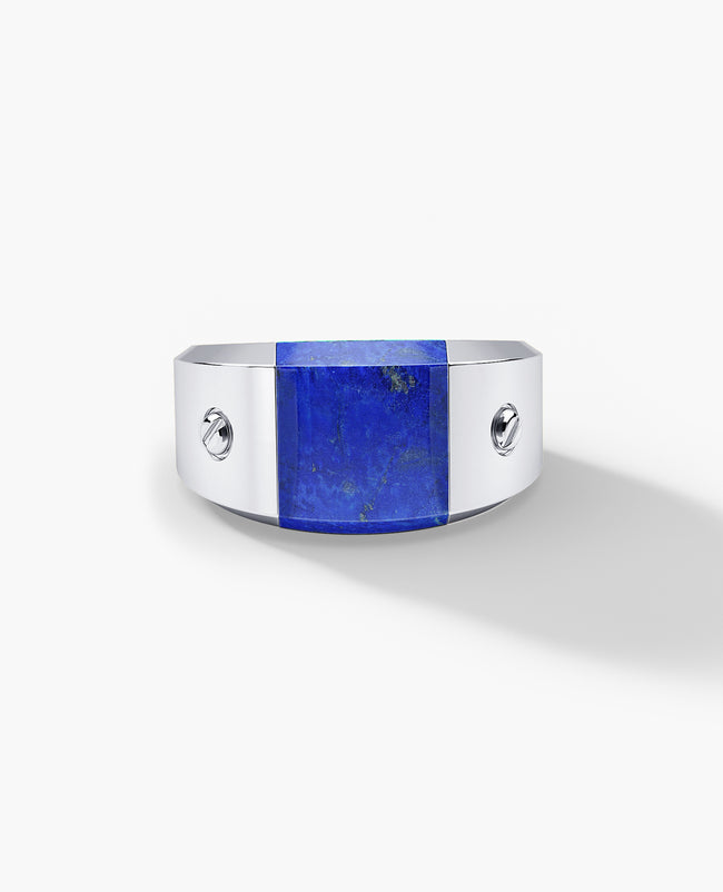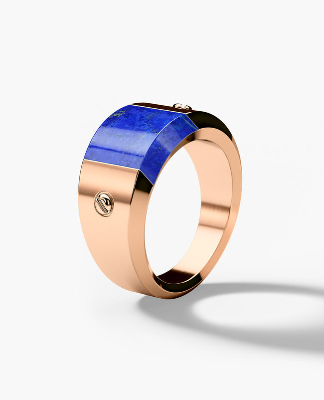 The MONTANA gold signet ring was designed with stunning classic solid gold. It includes a lapis stone as its bold centerpiece aligned smoothly inside the ring. With signature Rockford screws, creating the combination of luxury and style in the most elegant way. The ring is built with character as its round curves narrow close to the finger for a comfort fit. The MONTANA ring is perfect for a pinky ring or an everyday style choice.