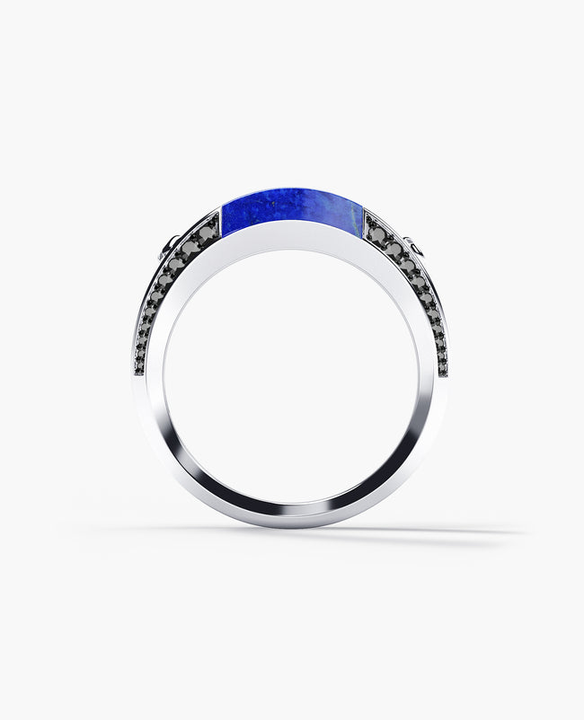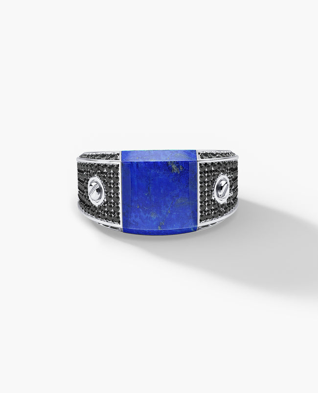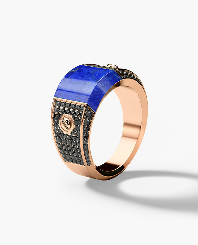 The MONTANA gold signet ring was designed with stunning classic solid gold. It includes a lapis stone as its bold centerpiece aligned smoothly inside the ring. With signature Rockford screws and 1.25ct black diamonds, creating the combination of luxury and style in the most elegant way. The ring is built with character as its round curves narrow close to the finger for a comfort fit. The MONTANA ring is perfect for a pinky ring or an everyday style choice.