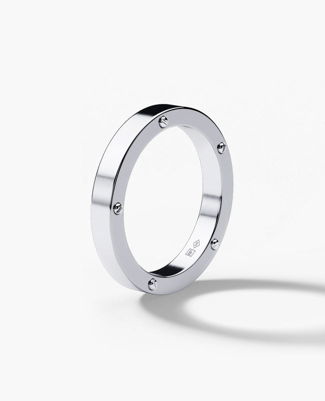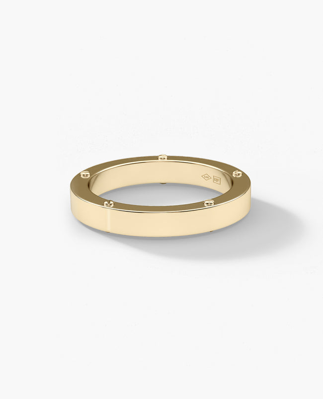 This solid gold or platinum ring is Rockford Collection's interpretation of a classic wedding band. The Norse ring is available in 2.5mm, 3mm, and 5 mm widths. Designed to be worn by all genders, the Norse is complete with Rockford's signature screw designs featured on either side. Personalize your ring further by adding a custom engraving to the inside or outside of your ring.
