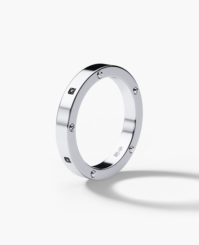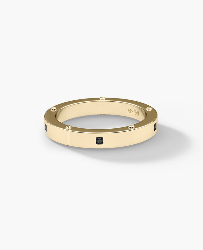 This Norse is Rockford Collection's interpretation of a classic wedding band. The Norse ring features a single 0.05 carat black diamond - a guiding light on your journey of life. This wedding band is available in 2.5 mm, 3.5 mm, or 5.5mm, and is complete with Rockford's signature screw details on either side. Personalize your ring further by adding a custom engraving to the inside or outside of your ring. Available in 14k gold, 18k gold, or platinum.