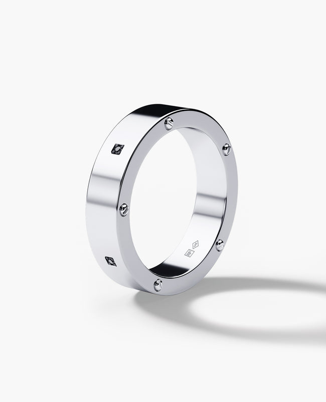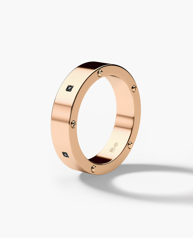 This Norse is Rockford Collection's interpretation of a classic wedding band. The Norse ring features a single 0.05 carat black diamond - a guiding light on your journey of life. This wedding band is available in 2.5 mm, 3.5 mm, or 5.5mm, and is complete with Rockford's signature screw details on either side. Personalize your ring further by adding a custom engraving to the inside or outside of your ring. Available in 14k gold, 18k gold, or platinum.