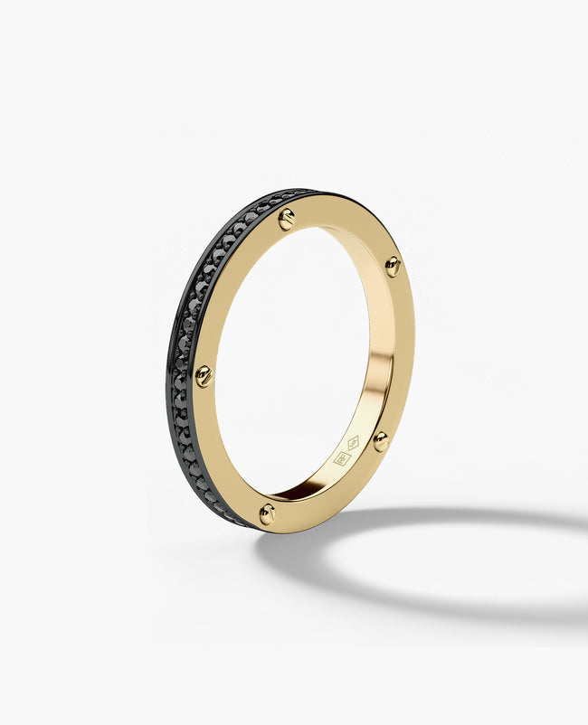 The Norse is Rockford Collection's interpretation of a classic wedding band. The Norse ring features a single row of 0.55 carat round brilliant cut black diamonds set fully around the band, reminding us that the journey we are embarking on together is eternal. This wedding band is available in 2.5 mm, 3.5 mm, or 5.5mm, and is complete with Rockford's signature screw details on either side. Personalize your ring further by adding a custom engraving to the inside or outside of your ring. Available in 14k gold, 18k gold, or platinum.