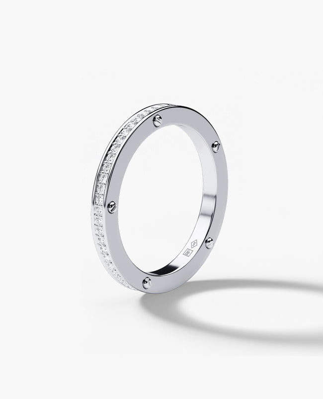 The Norse is Rockford Collection's interpretation of a classic wedding band. The Norse ring features a single row of 0.55 carat round brilliant cut black or white diamonds set fully around the band, reminding us that the journey we are embarking on together is eternal. This wedding band is available in 2.5 mm, 3.5 mm, or 5.5mm, and is complete with Rockford's signature screw details on either side. Personalize your ring further by adding a custom engraving to the inside or outside of your ring. Available in 14k gold, 18k gold, or platinum.