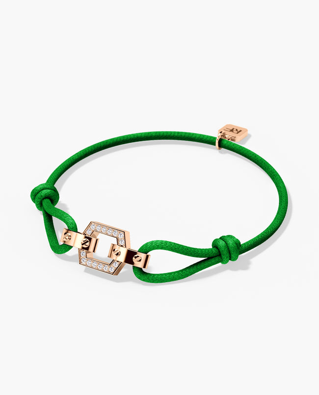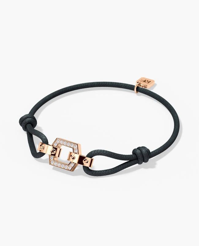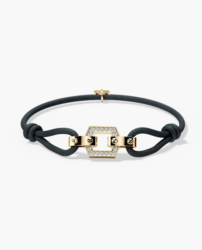 This handmade silk cord bracelet is available in both gold and platinum and is fully customizable with either natural black or white diamonds. Customize your bracelet further by choosing silk cord in a variety of colors.