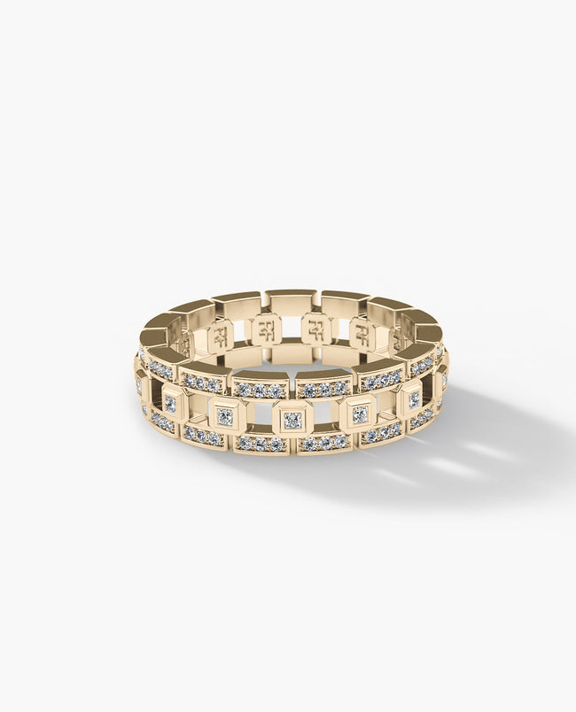 The design of this band bridges two different styles in its variations of 0.50ct white diamond pave setting and metals: contemporary classic and cutting-edge modern. The La Paz, often enjoyed as an exceptional statement piece, can even be worn as a designer wedding ring. Ready to Ship rings are pre-produced, unworn pieces. These rings have a short turn-around time of only 1-2 business days.