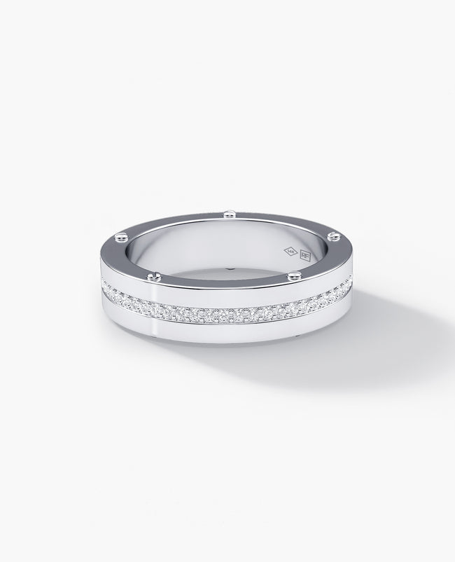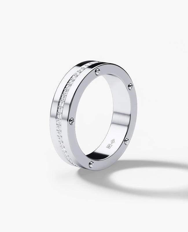 The Norse is Rockford Collection's interpretation of a classic wedding band. The Norse ring features a single row of 0.55 carat round brilliant cut white diamonds set fully around the band, reminding us that the journey we are embarking on together is eternal. Personalize your ring further by adding a custom engraving to the inside or outside of your ring. Ready to Ship rings are pre-produced, unworn pieces. These rings have a short turn-around time of only 1-2 business days.